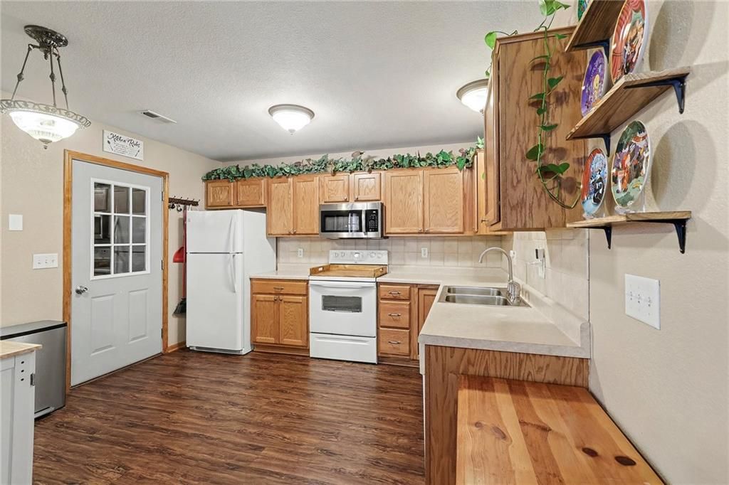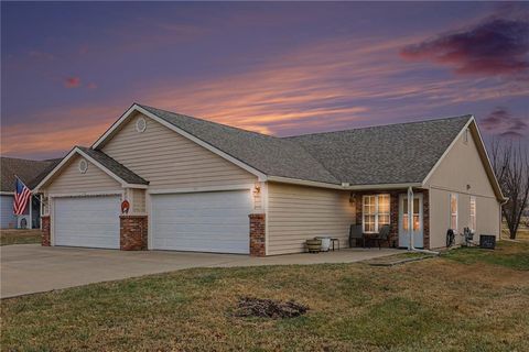 This may be YOUR Dream Home! Single level living with a view of the golf course. Enter the large living room with a vaulted ceiling. The living room is open to the kitchen/dining area for a great entertaining space. Down the hall is a full bathroom across from the Laundry Room/Utility Room. Great walk-in pantry/Linen Closet is just before the bedrooms. The large Primary bedroom has a full bath and deep walk-in closet with attic access. The other 2 bedrooms also have walk-in closets and are just beyond the primary suite. The back door is past the bedrooms. New storm door was recently added to the back door. Enjoy a cold beverage while watching the golfers from the patio. Expansive back yard to entertain your family and friends with plenty of room for yard games. All Entries are "zero entry" to accommodate easy access for all mobilities. This owner occupied half-duplex was recently painted throughout, including the 2 car garage. All kitchen appliances stay with the home. Quick access to 68 Hwy and I-35.