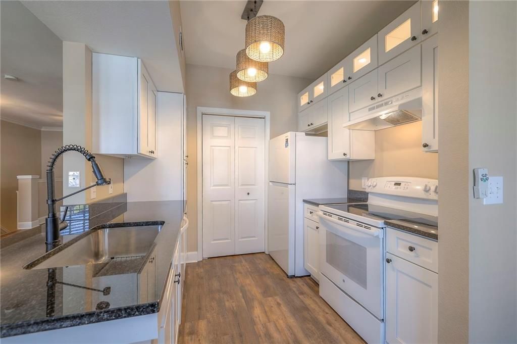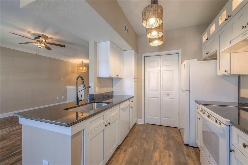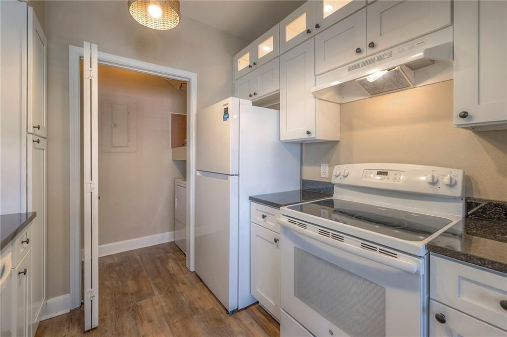 Completely updated and move-in ready! This beautifully renovated condo features brand-new flooring throughout, fresh paint, new windows, and solid oak doors. The entryway welcomes you with tiled flooring, wainscoting, and a new staircase. Enjoy modern lighting, updated ceiling fans, and a custom-built bookshelf for added charm. The kitchen shines with new cabinetry, granite countertops, updated lighting (including under-cabinet), a new sink, and garbage disposal. The bathroom includes a new vanity, sink, toilet, glass shower door, mirror, shelving, and tile flooring. A bonus room as been reimagined into a home office with tile floors and built-in shelving - perfect for working from home. Updated blinds, stylish fixtures, and thoughtful finishes make this home truly stand out. This unit includes one designated parking spot directly outside of the unit! Nothing left to do but move in and enjoy!