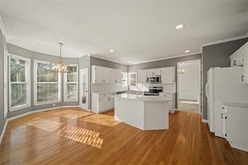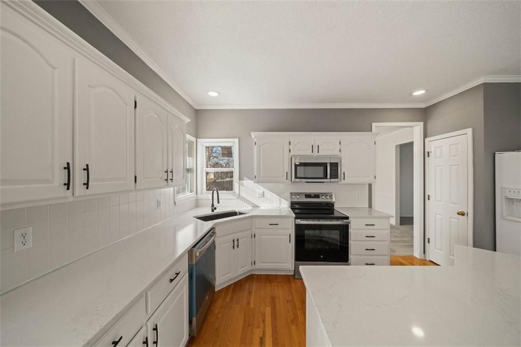 Extensively updated home with 4 beds and 4.5 baths in the heart of the highly sought-after Blue Valley School District. Brand new windows throughout! Home features open concept layout, one year old paint throughout interior. Kitchen is equipped with brand-new stainless-steel appliances, one year-old high-quality quarts for counter tops. All cabinets are newly resurfaced. Hardwood flooring in kitchen and entrance area. One year old carpet throughout the rest living area including second floor. Upstairs, you will find total 4 bedrooms and 3 full baths. Spacious master bedroom comes with a sitting room and an updated bathroom. Hallway bathroom is fully renovated and there is another bedroom has its own bathroom (en suite) with newer tile flooring and lighting. Basement has its own bar area with cabinets and island with high quality quarts for counter tops. It can be a kitchen as it has stove and fridge plug- ins in place. High quality of vinyl planks for flooring, it comes with a fully renovated bathroom too! THE WALLS OF THE ROOMS CAN BE TAKEN OFF AND THE SPACE CAN BE RESTORED BACK INTO ONE OPEN SPACE. (No screws were screwed into flooring, so the floor is intact, seller can take them off upon buyer requests on offer). Brand new paint for exterior, deck is repaired and newly stained. New auto opener for garage. Home is priced to sell, make this extraordinary property your own!