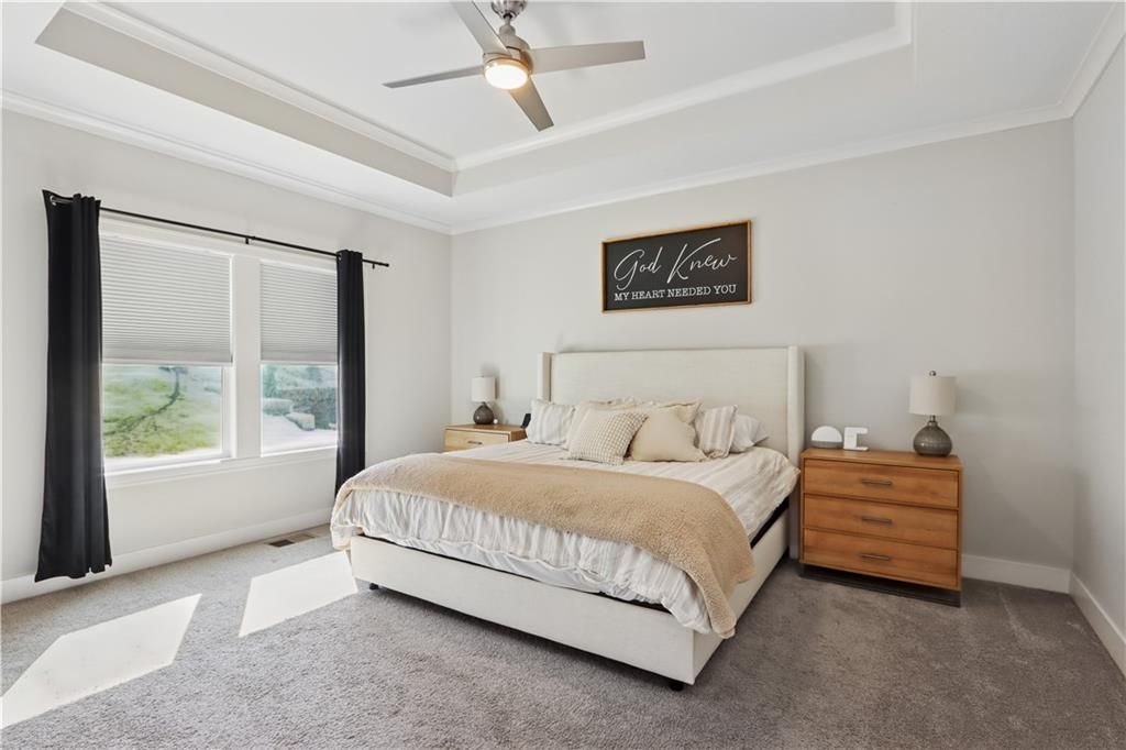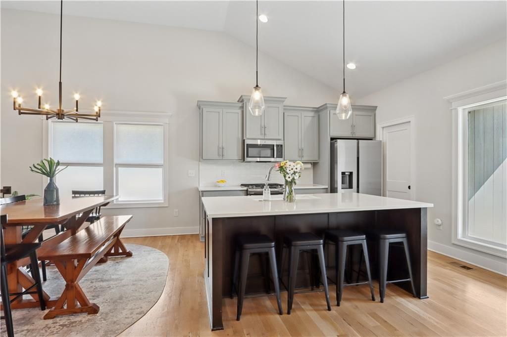 Life feels easier in this beautifully maintained, 4-year-old home nestled in the sought-after Estates of Timber Springs in Shawnee. Meticulously cared for, this residence blends modern style with everyday functionality. Inside, you'll find tall ceilings, hardwood floors, a stunning stone fireplace that anchors the living space, and a thoughtfully designed layout perfect for both relaxing and entertaining. The kitchen offers stunning hardwood cabinets, a generous pantry for storage, large island, stainless steel appliances, an open dining area, and doors to outdoor living. Step outside to enjoy the patio and backyard, ideal for gatherings or quiet evenings at home. The dedicated laundry room adds convenience to daily living next to the primary suite. This spacious primary suite serves as a private retreat, complete with double vanity sinks, walk-in shower, a well-appointed bath and walk-in closet. The three bedrooms upstairs feature a full bathroom, while the third bedroom has an ensuite bathroom - perfect for guests visiting. Additional highlights include a three-car garage, extra storage room in the basement, 4-year-old roof and HVAC system, and a radon mitigation system already in place for added peace of mind. Located in a walkable neighborhood close to parks, schools, shopping, dining and Lake Quivira Country Club, this home truly checks every box for comfort, quality, and location.