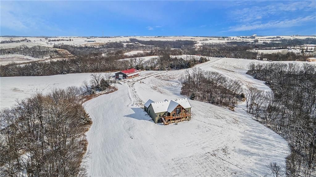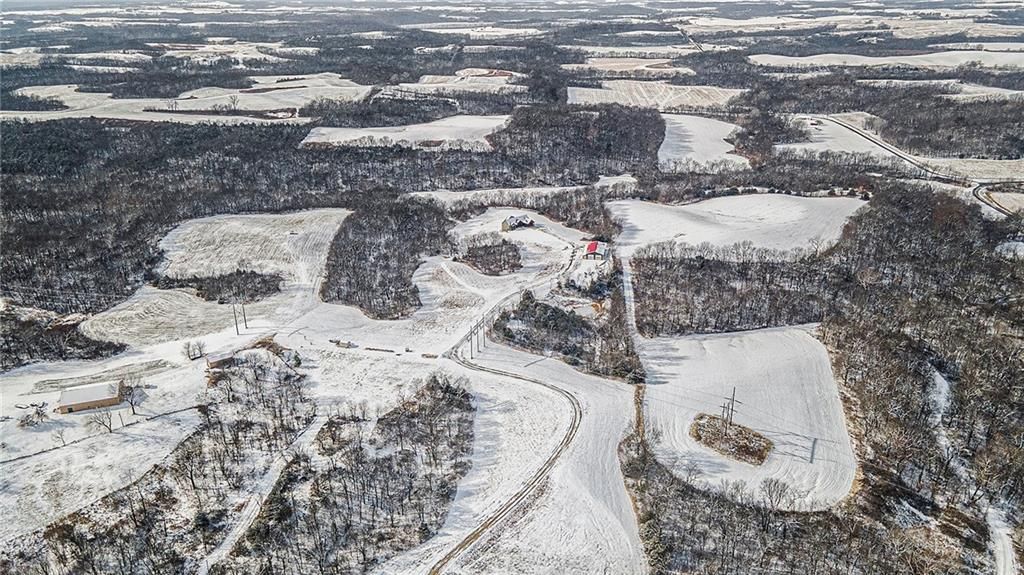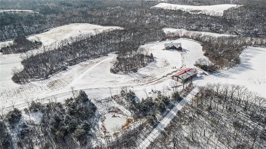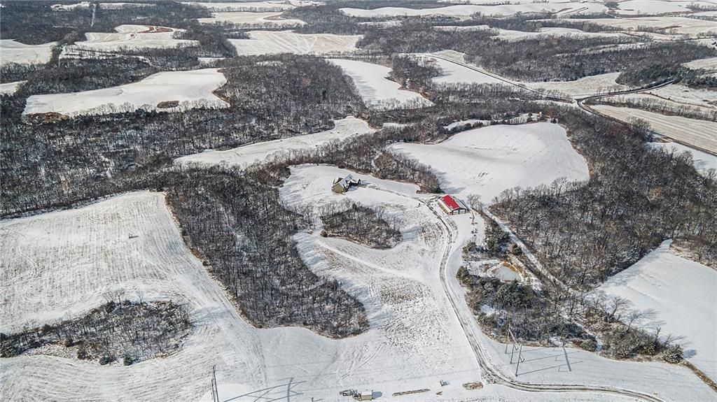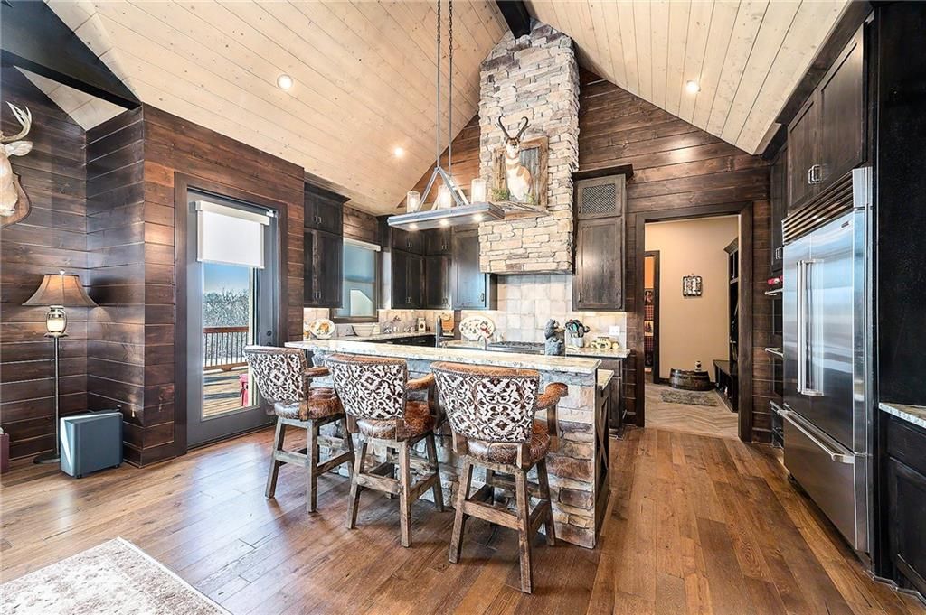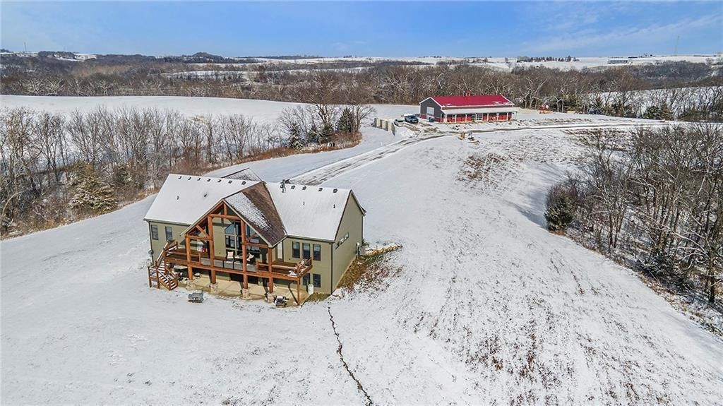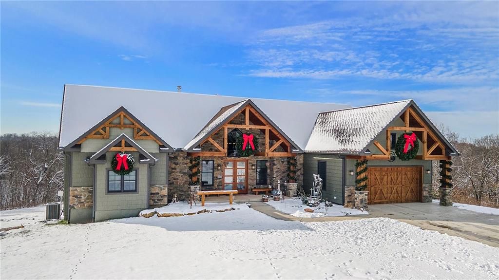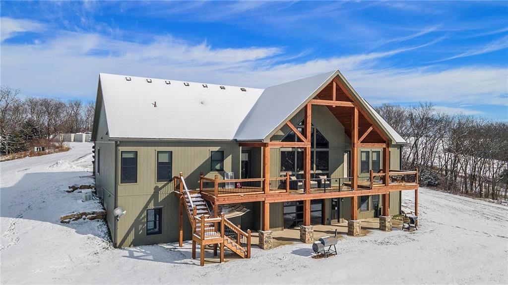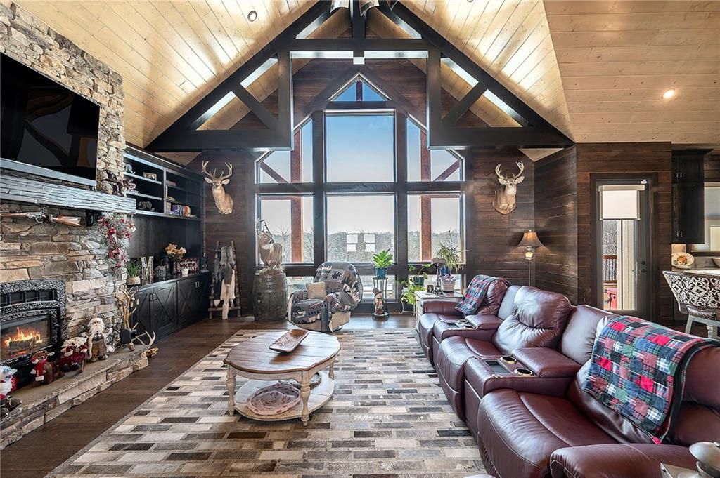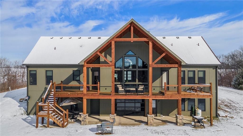 Exceptional custom-built, lodge-inspired home situated on approximately 60 scenic acres, offering privacy, panoramic views, and quality craftsmanship throughout. The home features a striking great room with vaulted ceilings, exposed timber beams, tongue-and-groove pine walls and ceilings, and a floor-to-ceiling stone fireplace with custom built-ins. The kitchen is thoughtfully designed with high-end stainless steel appliances, custom cabinetry, and generous workspace. The primary suite offers a private retreat with a spa-like bath featuring a copper claw-foot soaking tub. Warm wood tones, stone accents, and expansive windows create a seamless connection to the surrounding landscape. Outdoor living includes a covered deck and patio overlooking rolling terrain and timber. The property includes two outbuildings and a mix of open ground and wooded acreage, ideal for hunting, recreation, and nature enjoyment.
