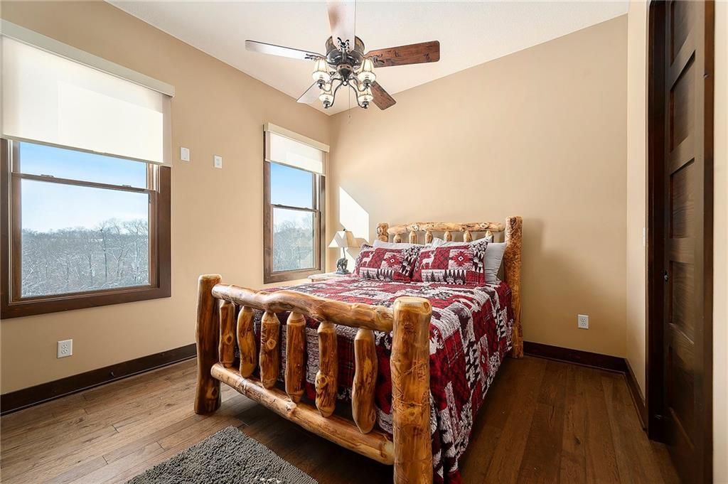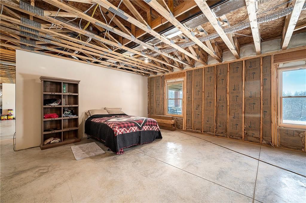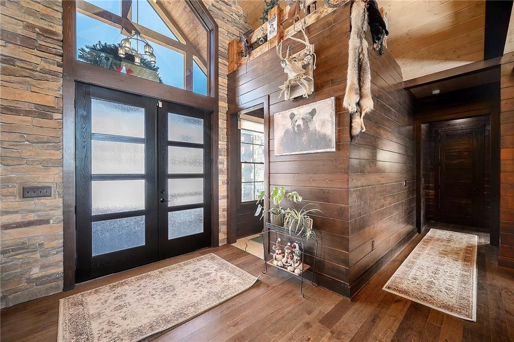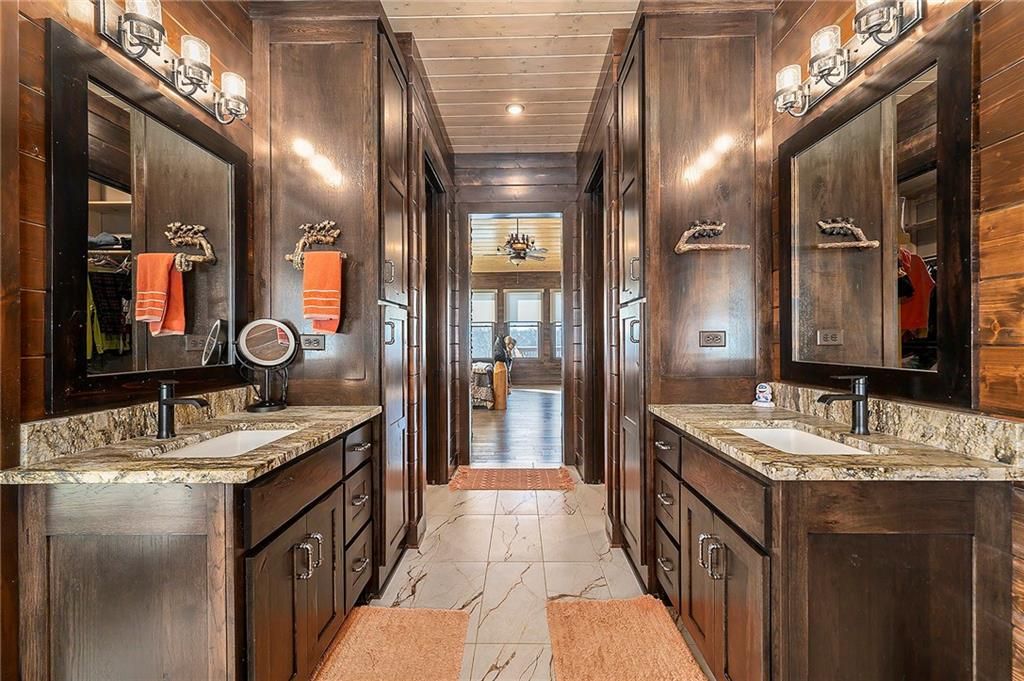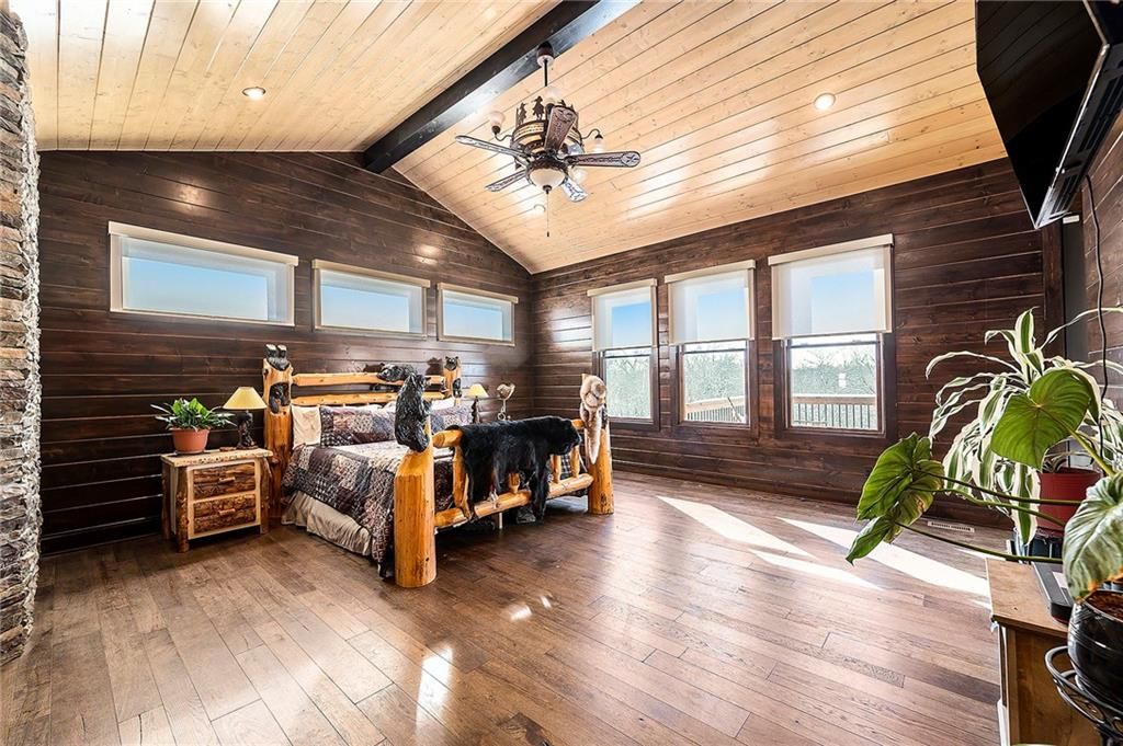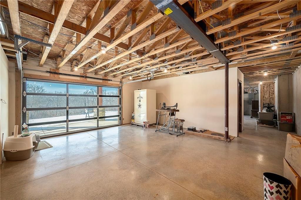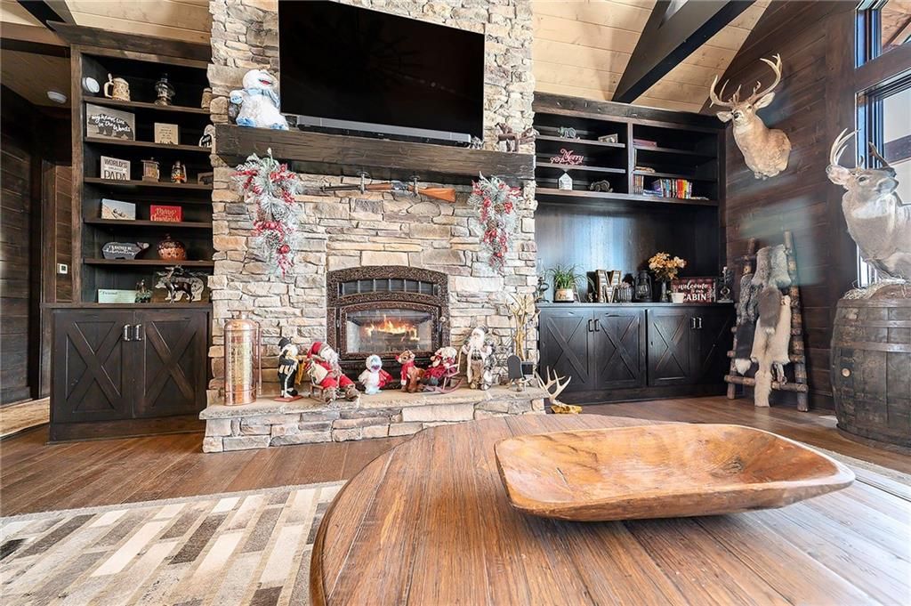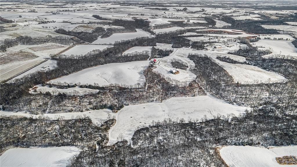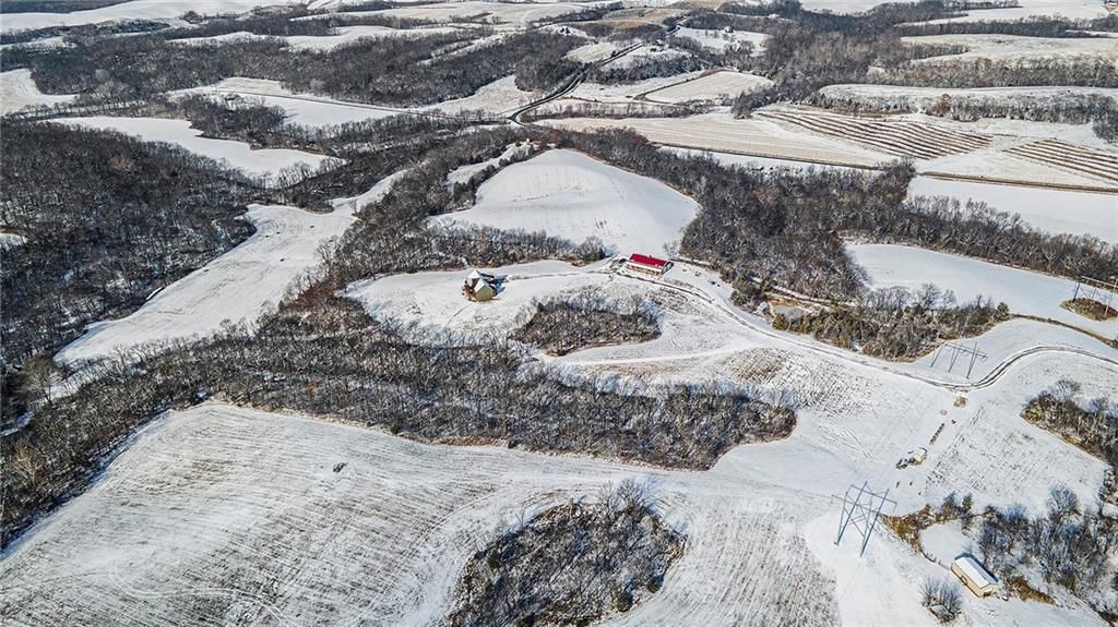 Exceptional custom-built, lodge-inspired home situated on approximately 60 scenic acres, offering privacy, panoramic views, and quality craftsmanship throughout. The home features a striking great room with vaulted ceilings, exposed timber beams, tongue-and-groove pine walls and ceilings, and a floor-to-ceiling stone fireplace with custom built-ins. The kitchen is thoughtfully designed with high-end stainless steel appliances, custom cabinetry, and generous workspace. The primary suite offers a private retreat with a spa-like bath featuring a copper claw-foot soaking tub. Warm wood tones, stone accents, and expansive windows create a seamless connection to the surrounding landscape. Outdoor living includes a covered deck and patio overlooking rolling terrain and timber. The property includes two outbuildings and a mix of open ground and wooded acreage, ideal for hunting, recreation, and nature enjoyment.