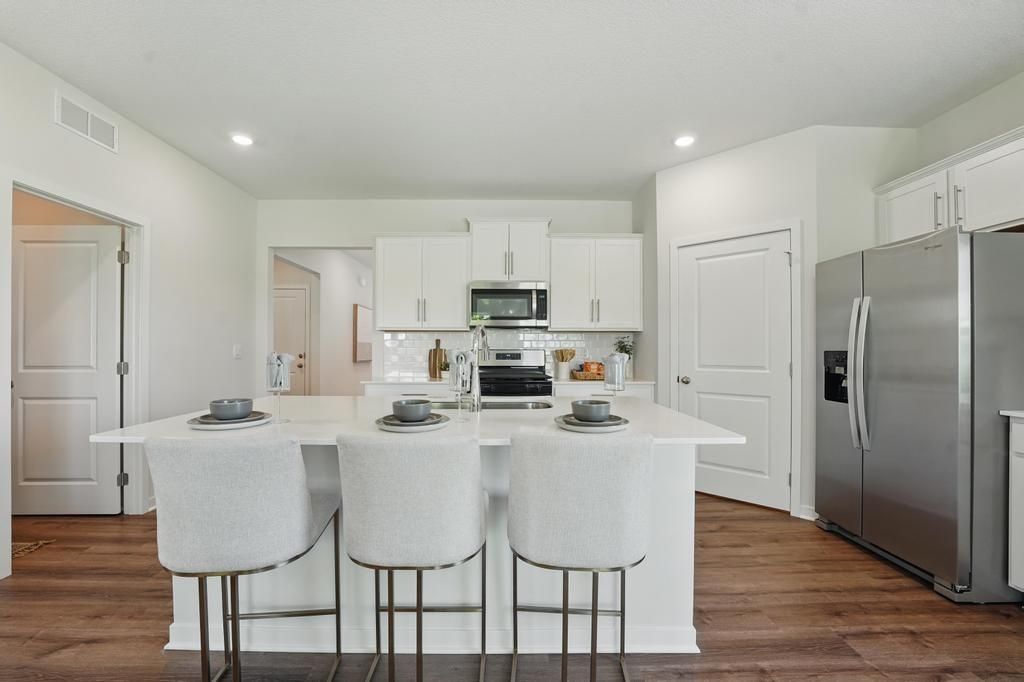 The Newcastle is a ranch plan featured at Prairie Trace in Gardner, KS near Kansas City. This is a spacious and modern home designed with open-concept living carefully considered throughout. This home features three bedrooms, two bathrooms, and a two-car garage. An inviting foyer greets you upon entering and leads you into the heart of the home. This open plan features a family room, dining room, and kitchen designed with entertaining in mind. The kitchen is equipped with a pantry, 36" cabinets with crown molding, quartz countertops with tile backsplash, stainless steel appliances, and a large island with a breakfast bar, making it perfect for both dining and guests. The luxurious primary suite offers a large walk-in closet and a primary bathroom with dual vanities and plenty of space to get ready. The additional two bedrooms share access to the secondary bathroom on the opposite side of the home offering privacy from the primary suite. With its thoughtful design, the Newcastle ranch floorplan is the perfect place to call home at Prairie Trace in Gardner, KS near beautiful Kansas City. Pictures are representative. Home is under construction. Estimated completion April 10th.