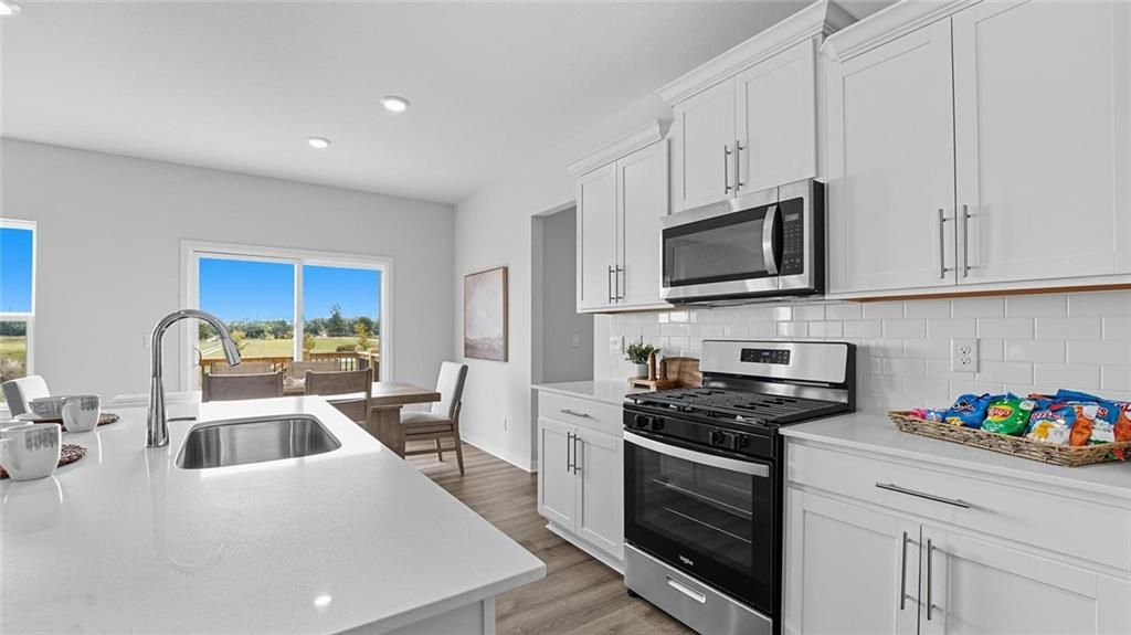 Welcome to Prairie Trace, where modern design meets timeless elegance in this exceptional home crafted by D.R. Horton, America's Builder. This home stands out with James Hardie siding and stone and shake shingle accents, providing both durability and timeless curb appeal. You'll be greeted with a three-rail, two-panel insulated front door that enhances both curb appeal and energy efficiency. Step inside to find a beautifully appointed interior with 9-foot ceilings that exude sophistication. The chef's kitchen is the heart of the home, featuring 36-inch painted maple cabinets, quartz countertops, and state-of-the-art Whirlpool stainless steel appliances. Bathrooms feature quartz-topped vanities and Moen chrome faucets. The primary bath offers a 5-foot shower with a framed glass enclosure. This home is designed for the future with advanced Smart Home technology, including a Honeywell Pro Z-Wave Thermostat, Amazon Echo, and a connected home panel, allowing you to control and monitor your home from anywhere. Energy efficiency is prioritized with LED lighting throughout, a high-efficiency gas furnace, and insulated low E vinyl windows, ensuring comfort and savings year-round. Additional features such as luxury vinyl plank flooring, a spacious garage with opener(s), and detailed wiring solutions like dual data/TV lines in the main bedroom and family room, enhance both convenience and style. D.R. Horton's commitment to quality is evident in every aspect of this home, offering you a place where luxury, technology, and comfort come together seamlessly. Don't miss your chance to own this extraordinary home in Prairie Trace. Schedule your private tour today and experience the D.R. Horton difference!