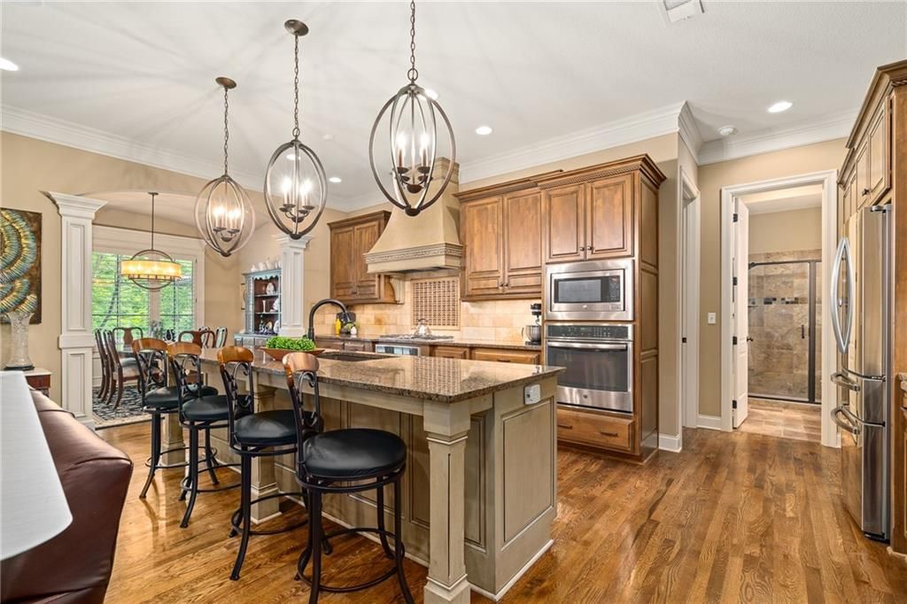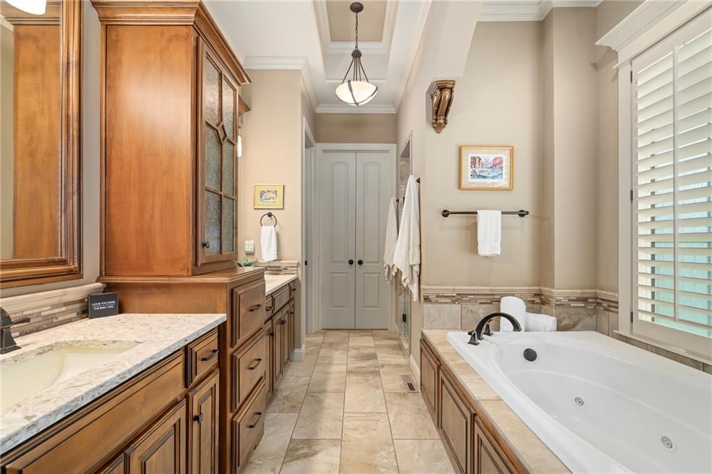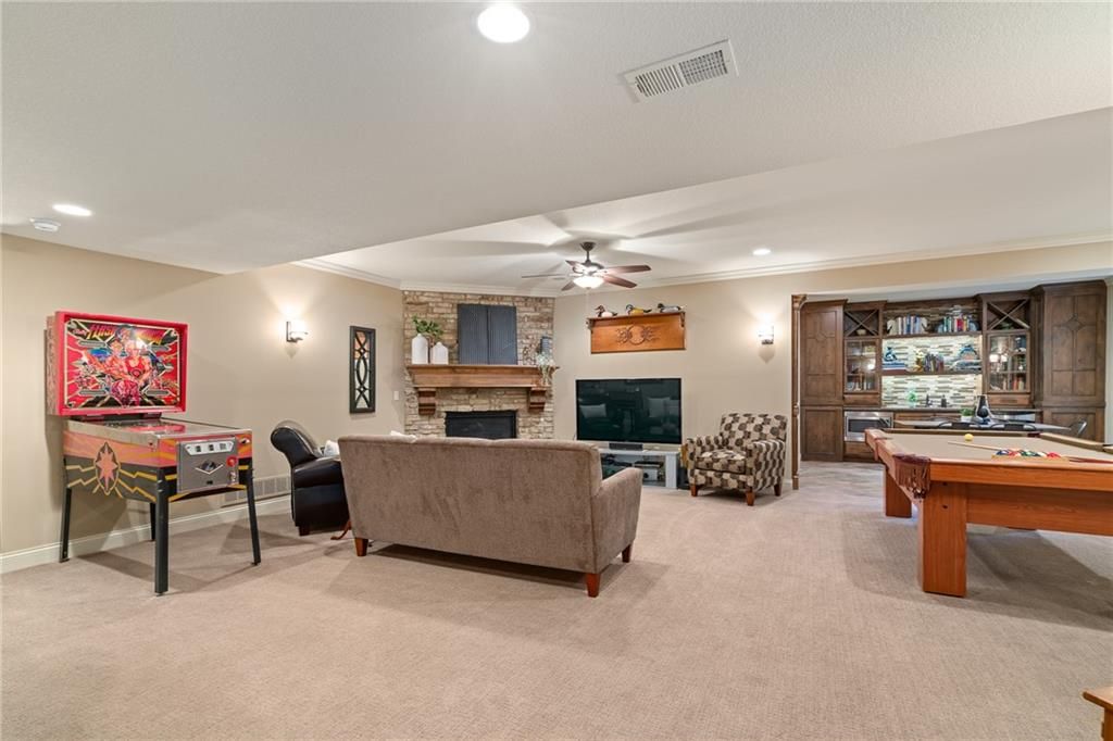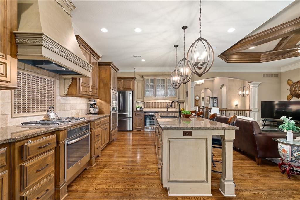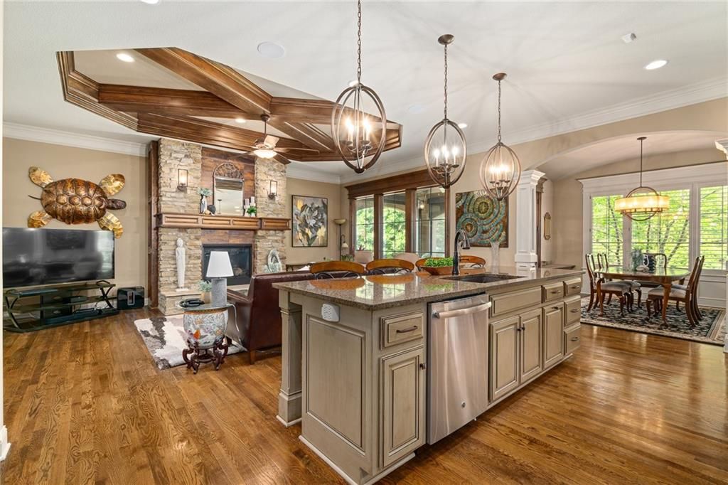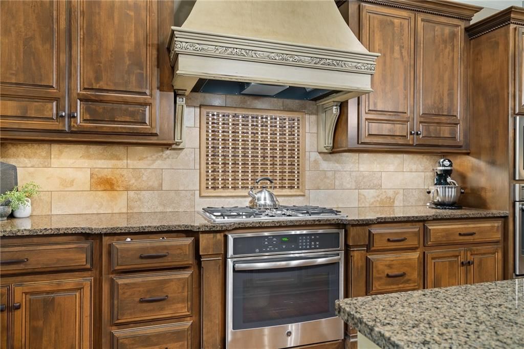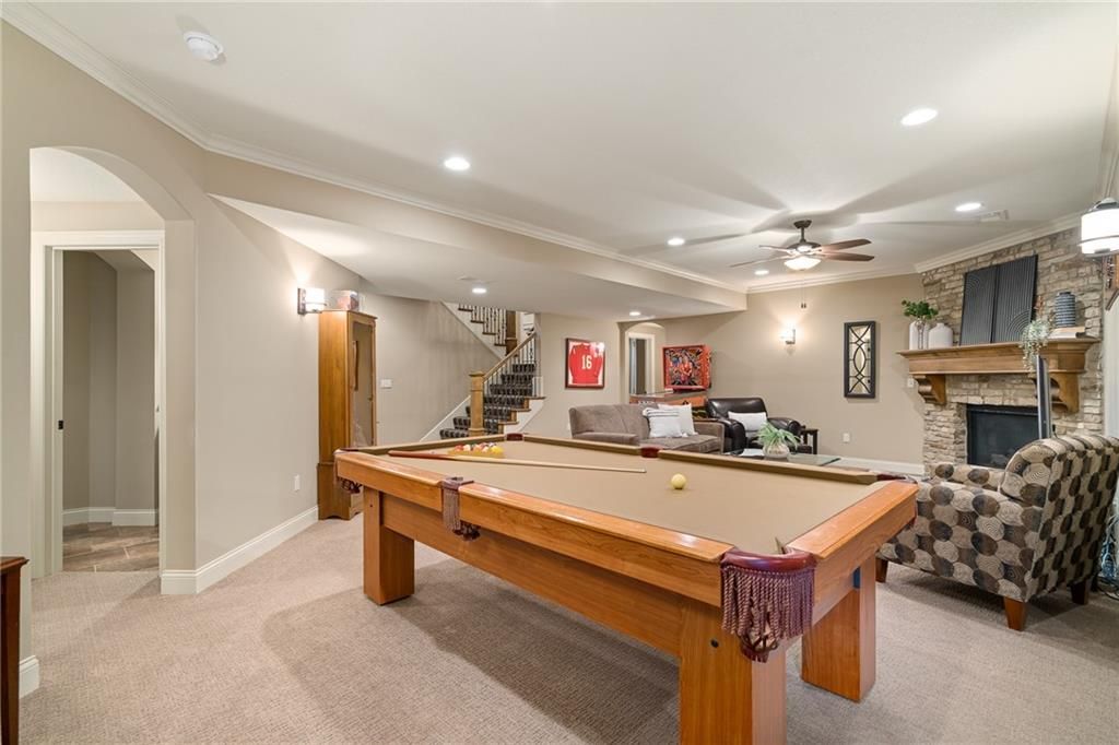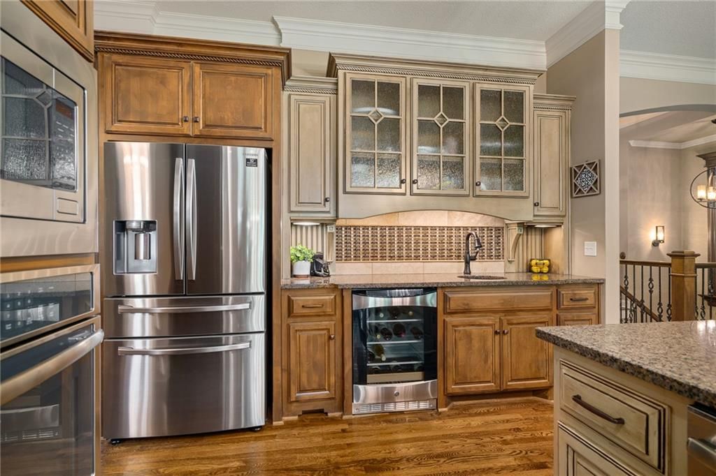 Luxury Reverse 1.5-Story Home in Prestigious Tuscan Piazza - Leawood! You have to see this home to truly appreciate the craftsmanship. Welcome to effortless elegance in one of Leawood's most exclusive maintenance-FREE communities. This meticulously maintained 4-bed, 4-bath reverse 1.5-story home offers refined living and artistry construction by Tom French with attention to detail throughout. Enjoy main-level living with a spacious primary suite featuring a spa-like bath, custom built-ins, whirlpool tub, oversized walk-in closet, and direct laundry access. An additional main-floor bedroom and full bath accommodate guests or a home office with ease. The open-concept design is ideal for both daily living and entertaining - highlighted by TALL wooden entry doors, rich hardwood floors, vaulted tray ceilings with beam detail, custom millwork, and a chef's kitchen with quartz island, gas cooktop, and wet bar area. A sun-drenched dining room opens to a paver patio with plenty of space to grill and entertain along with retractable screens on the covered patio allowing you to have a screened in porch or open-air patio -- all at the touch of a button - perfect for private outdoor living. The lower level offers a sophisticated retreat with a second fireplace, full wet bar, rec space, two bedrooms, TWO full bathrooms, and unfinished area that is set up with a workbench and plenty of storage. A rare 3-car garage includes epoxy floors, extra insulation, and a climate-controlled single bay - perfect for a workshop, studio, craft area, or collector vehicle. Maintenance-FREE living with mature landscaping, privacy, and unmatched convenience. Just lock and leave with confidence - luxury, lifestyle, and location come together seamlessly. THIS IS THE ONE!