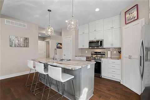More space than you imagined, both inside and out! The kitchen features high end appliances, quartz counters, island, walk-in pantry, and ample cabinets. Note: NEW stove and INSTANT HOT WATER throughout the home. Main-level living and dining enhanced by an inviting gas fireplace and peaceful view of treed greenspace beyond. Step outside to the SCREENED-IN DECK or charming patio, perfect for evening relaxation. The primary bedroom is a true retreat, complete with/spacious walk-in closet and ensuite w/double vanity and walk-in shower w/bench. Hall bath also includes double vanity and shower over deep soaker tub. Large laundry room equipped with built-ins for hanging and additional storage. The finished basement offers a cozy sitting room, full bath, bedroom w/walk in closet that could serve as 2nd primary suite, and three unfinished storage areas. There s no shortage of storage in this home, with ample space available in the basement, laundry room, garage, and enclosed under deck storage. HOA INCLUDES: lawn maintenance (mowing, fertilizing, weed, grub control), snow removal, spring mulch, exterior paint. Located in highly walkable neighborhood, you'll enjoy sidewalks that connect to the Kill Creek Streamway Park trail, offering a scenic paved path for biking, jogging, and hiking enthusiasts.