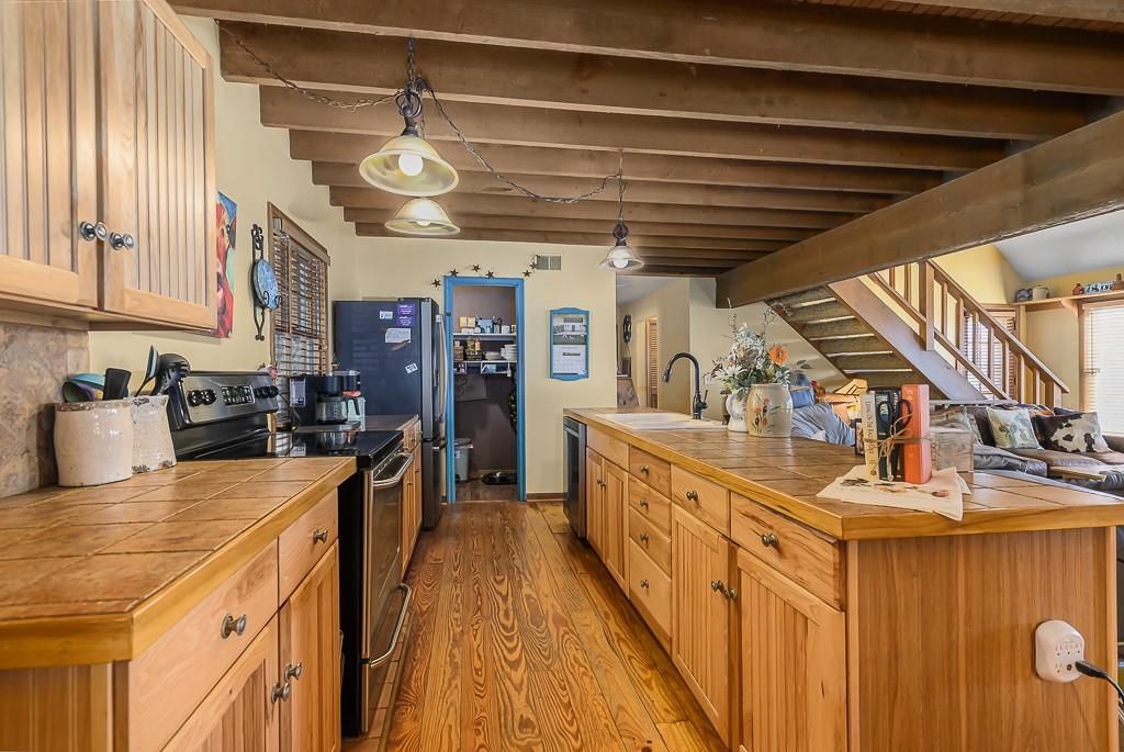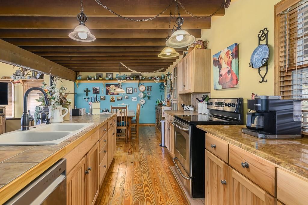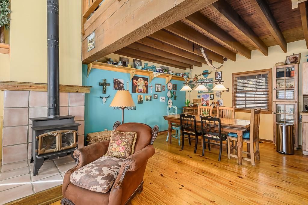 Welcome to this warm and inviting rustic home nestled on a beautiful 1-acre lot that backs directly to serene woods. From the moment you arrive, the charm is unmistakable - wide plank wood floors, a commanding exposed beam, and an open, airy layout create a space that feels both timeless and comfortable. Relax on the front porch, the perfect spot to sit, rock, and watch the world slow down. The property is a haven for nature lovers, with deer, turkey, and abundant wildlife frequent visitors to your backyard. Inside, the home's rustic character shines through natural materials, warm wood accents, and a layout designed for easy living. Whether you're entertaining guests or enjoying quiet evenings at home, the open living spaces offer plenty of room to gather and unwind. Fire up the wood stove on a chilly night. With its peaceful wooded backdrop, classic country charm, and inviting outdoor spaces, this property offers the private sanctuary you've been searching for. HVAC system approx. 2 years old. On 1.13 acres, secluded and private. Wheel chair accessible ramp in the front.