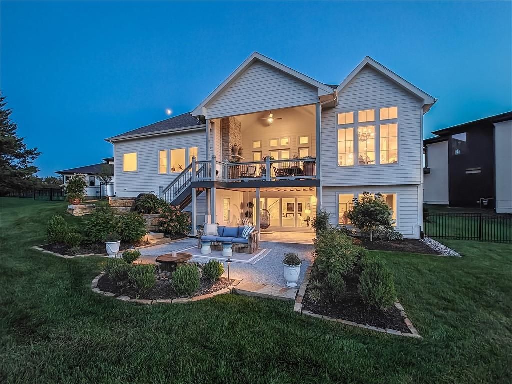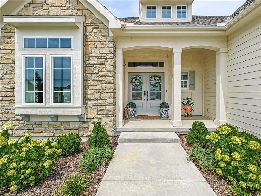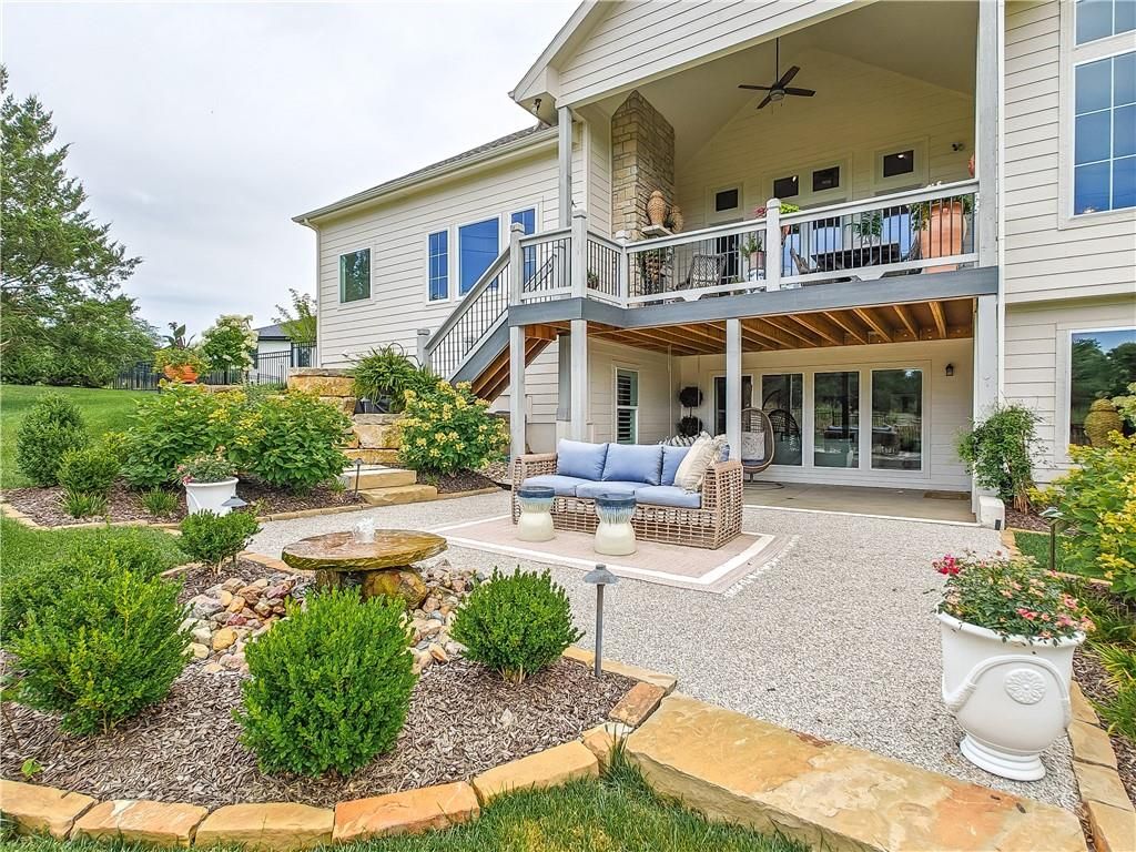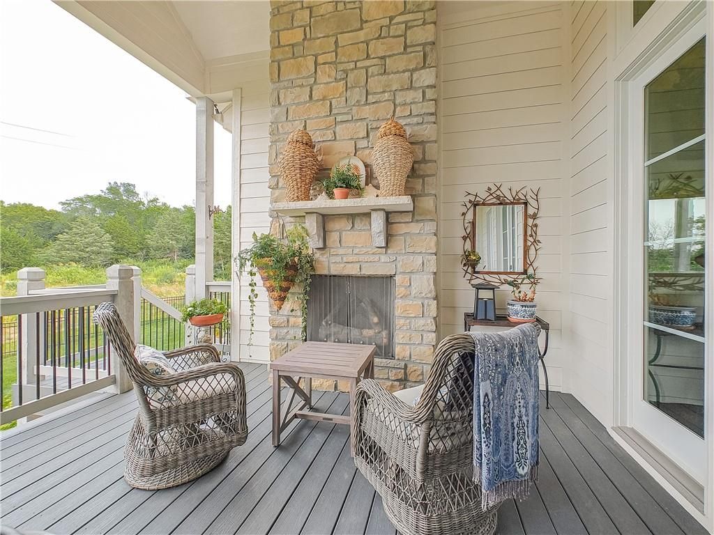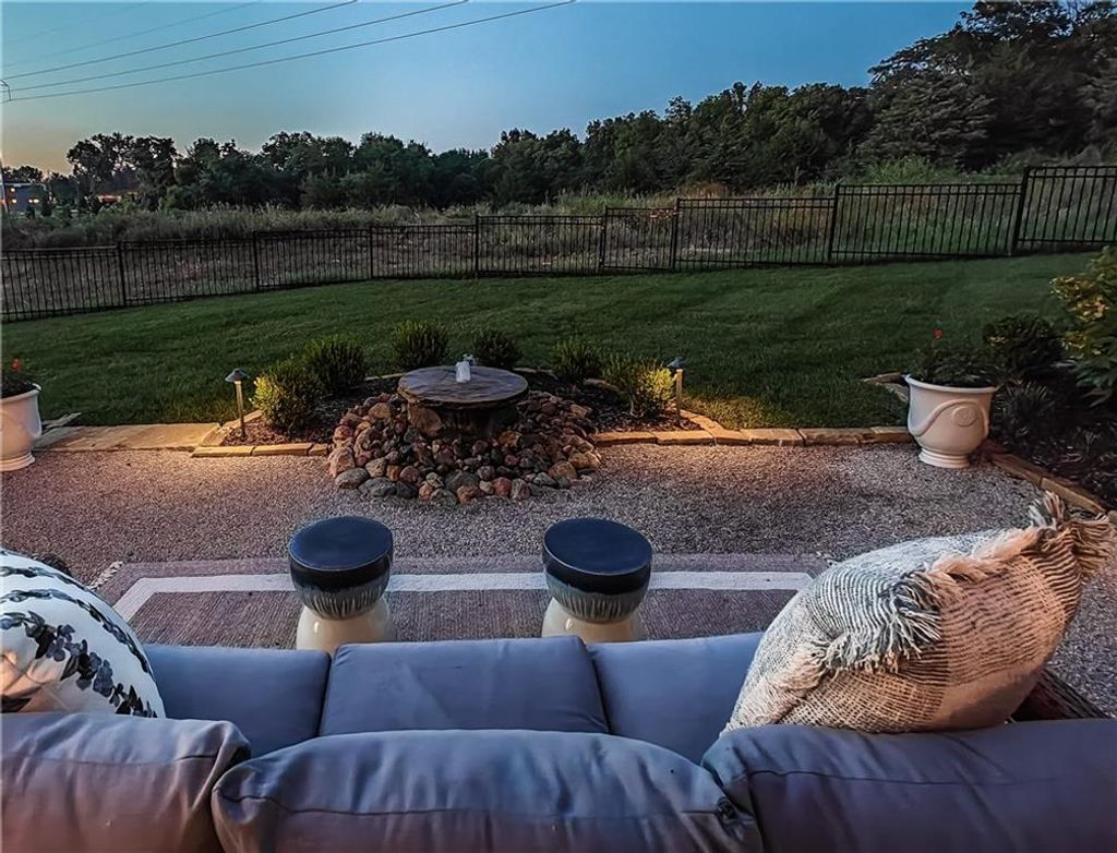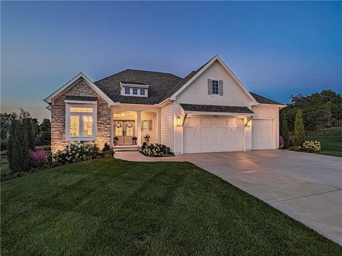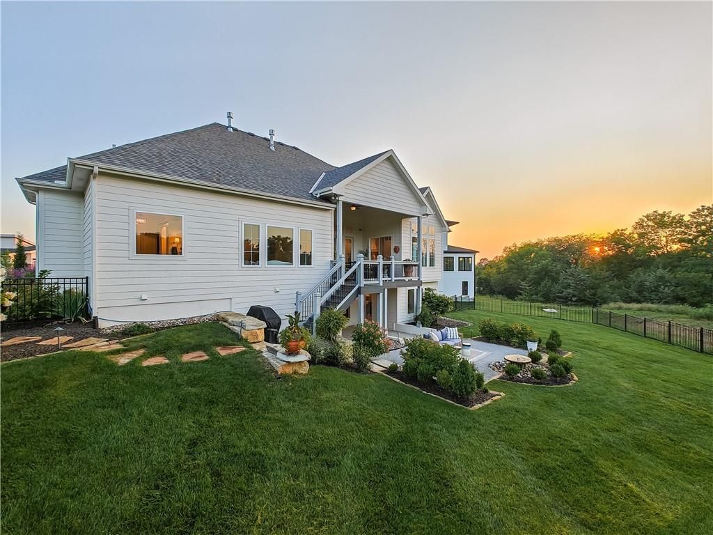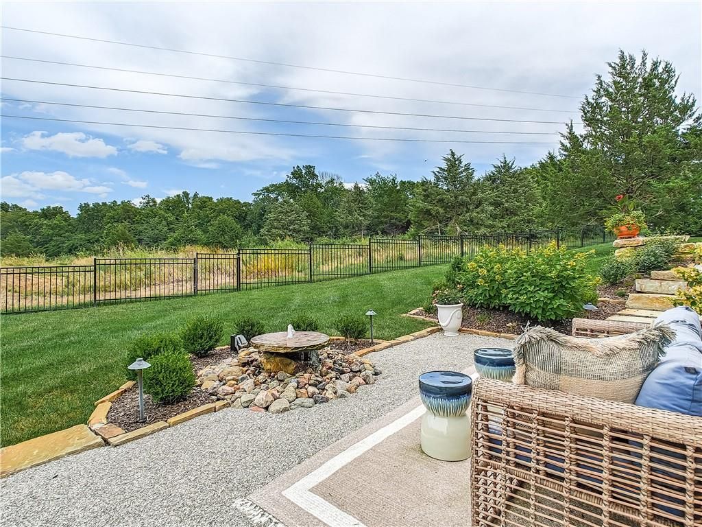 Avoid the uncertainty of new construction with its unforeseen delays and expenses. This nearly new, 2-year-old beauty is better than new construction with established landscaping, fenced back yard and premium upgrades throughout. This 4-bedroom James Engle Stoneybrook Expanded Reverse 1.5-story home delivers all the features you want, without the wait. Nestled on what many call the most coveted lot in Wilshire Hills, this home backs to lush, wooded green space with no neighbors in sight, offering unmatched privacy and tranquility. Expansive windows create a seamless transition from indoors to outdoors. French doors take you to a covered deck and fireplace. From there, stairs lead to the lower level patio with fountain, extending your living space and entertainment options. The kitchen, with custom inset cabinetry, is extra special with a large breakfast area, a prep kitchen, and large pantry. Every appliance is top-of-the line, including the Subzero fridge. The marble island contains a large farm sink. A formal dining room is conveniently located directly off of the prep kitchen. The open-concept main level features a great room with stone fireplace, a powder room with wall mount faucets above the sink and two bedrooms, each with ensuite. The large primary bathroom has custom inset cabinets, custom makeup area, heated marble floors, shower and spa tub. The bright, lower level living area has a fireplace for cozy evenings in front of the TV, or entertain in the bar area with its abundant cabinets, sink, microwave, beverage fridge and large island. There are two bedrooms with Jack and Jill bathroom as well as a half bath that complete the walk-out lower level. Enjoy the perfect blend of thoughtful design, luxury finishes, and a move-in ready experience - all in one remarkable home. Wilshire Hills is conveniently close to 69 HWY, and the Bluhawk shopping center with grocery, retail, dining and soon a theater.