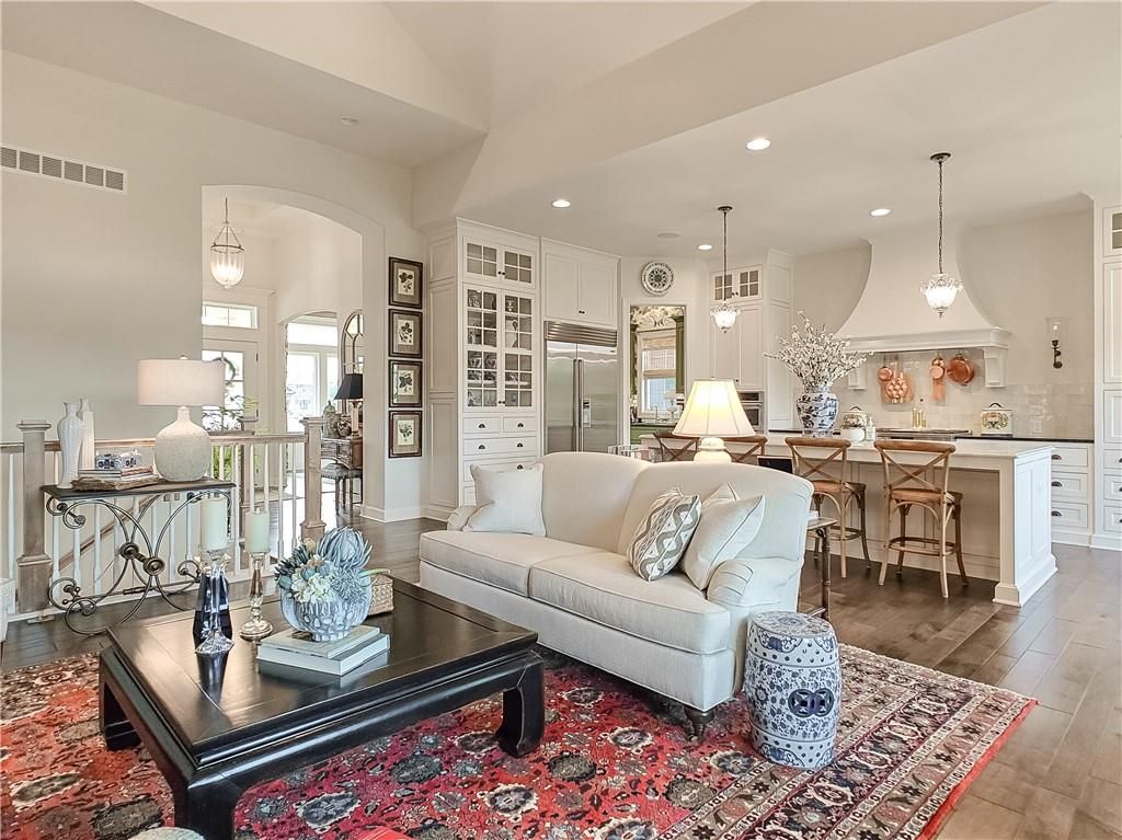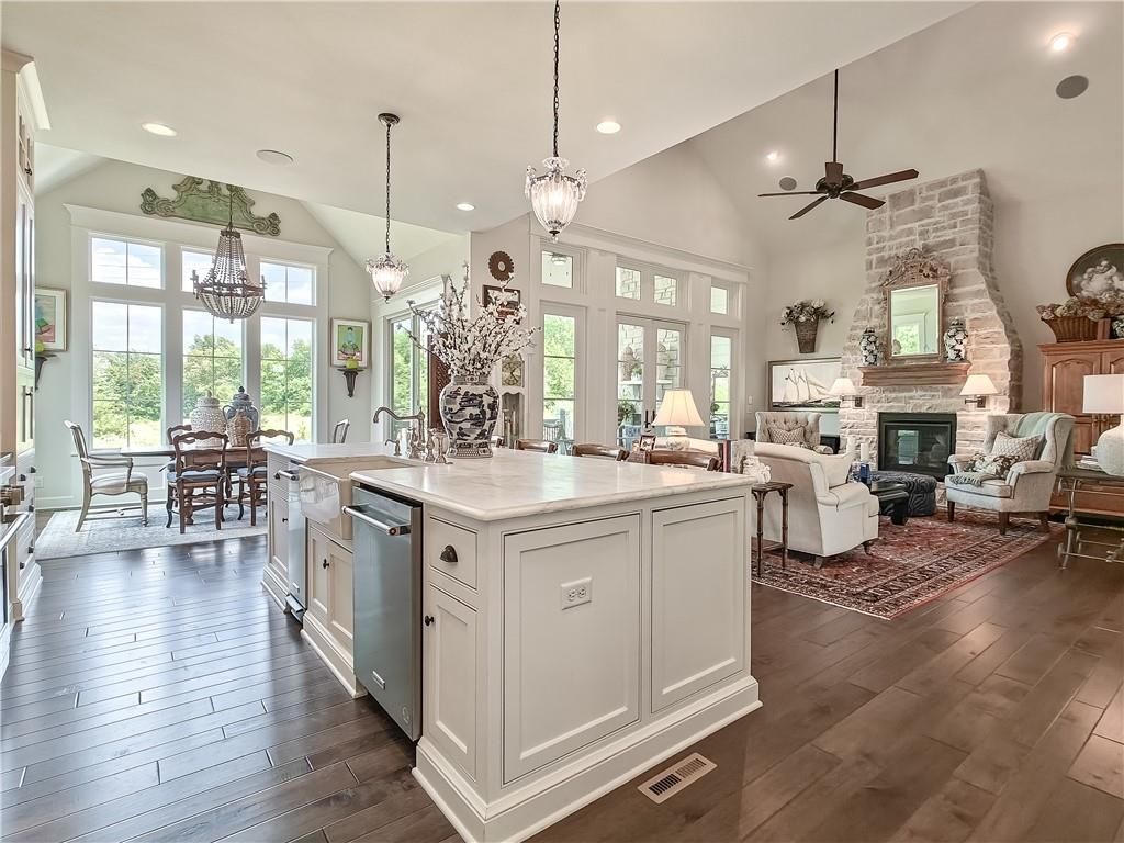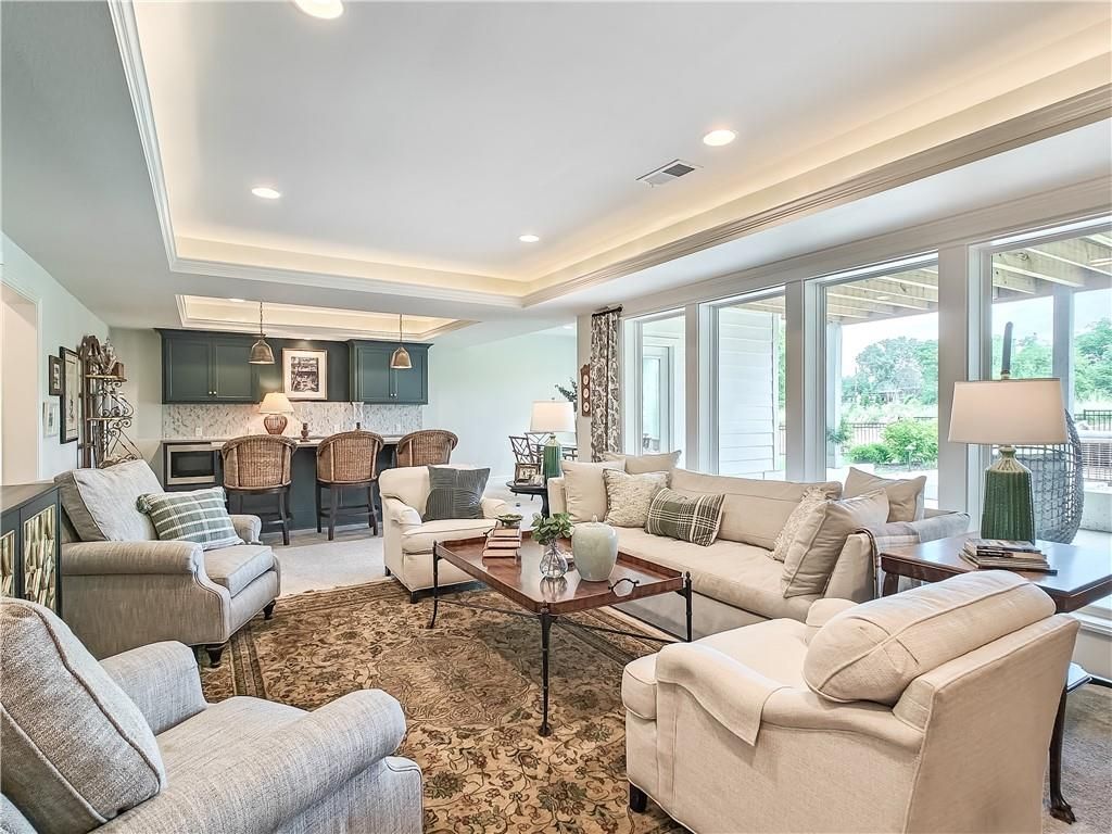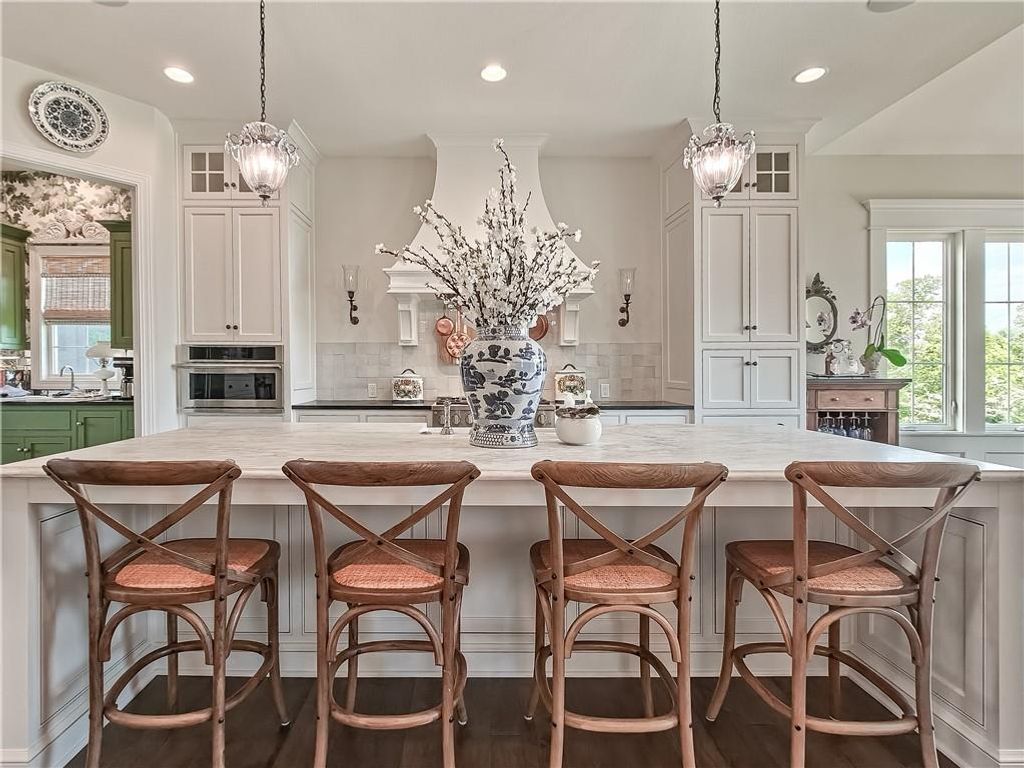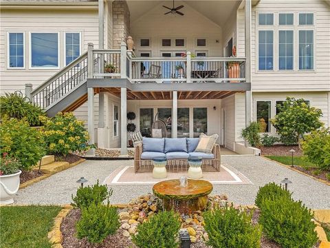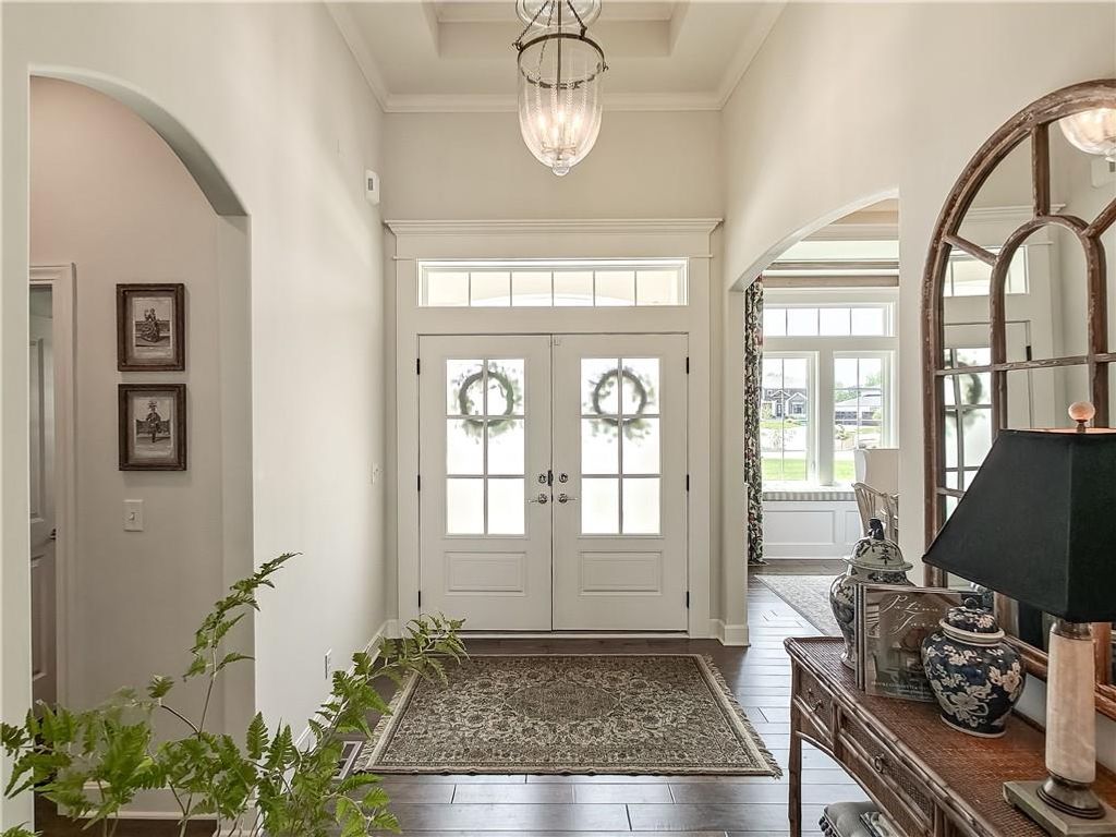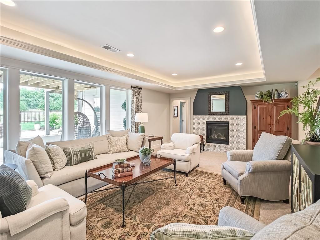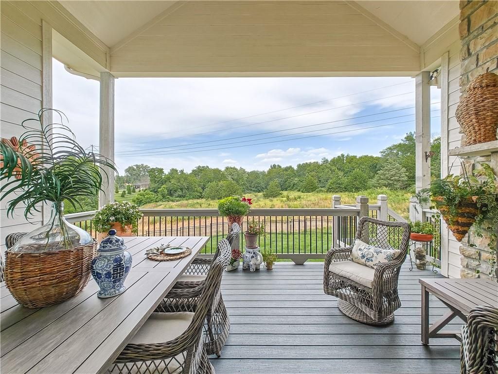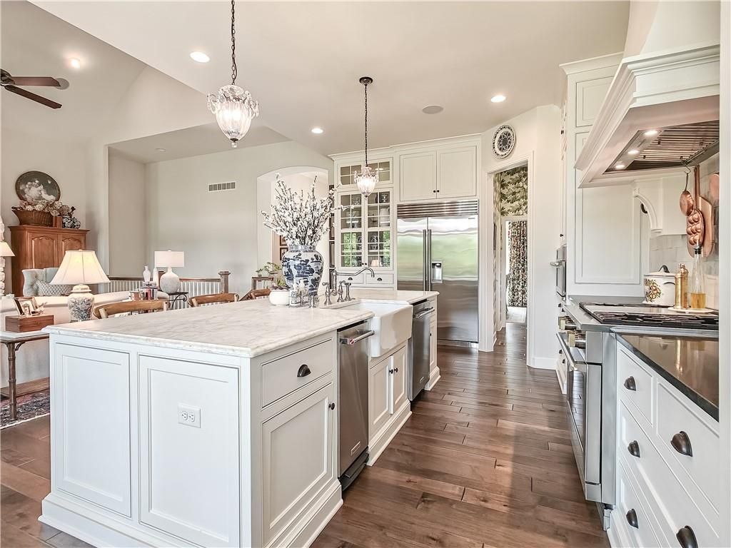 Avoid the uncertainty of new construction with its unforeseen delays and expenses. This nearly new, 2-year-old beauty is better than new construction with established landscaping, fenced back yard and premium upgrades throughout. This 4-bedroom James Engle Stoneybrook Expanded Reverse 1.5-story home delivers all the features you want, without the wait. Nestled on what many call the most coveted lot in Wilshire Hills, this home backs to lush, wooded green space with no neighbors in sight, offering unmatched privacy and tranquility. Expansive windows create a seamless transition from indoors to outdoors. French doors take you to a covered deck and fireplace. From there, stairs lead to the lower level patio with fountain, extending your living space and entertainment options. The kitchen, with custom inset cabinetry, is extra special with a large breakfast area, a prep kitchen, and large pantry. Every appliance is top-of-the line, including the Subzero fridge. The marble island contains a large farm sink. A formal dining room is conveniently located directly off of the prep kitchen. The open-concept main level features a great room with stone fireplace, a powder room with wall mount faucets above the sink and two bedrooms, each with ensuite. The large primary bathroom has custom inset cabinets, custom makeup area, heated marble floors, shower and spa tub. The bright, lower level living area has a fireplace for cozy evenings in front of the TV, or entertain in the bar area with its abundant cabinets, sink, microwave, beverage fridge and large island. There are two bedrooms with Jack and Jill bathroom as well as a half bath that complete the walk-out lower level. Enjoy the perfect blend of thoughtful design, luxury finishes, and a move-in ready experience - all in one remarkable home. Wilshire Hills is conveniently close to 69 HWY, and the Bluhawk shopping center with grocery, retail, dining and soon a theater.