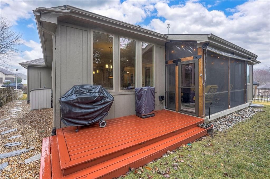 Nestled in a quiet cul-de-sac, this EXTREMELY WELL-MAINTAINED 2,800 SF ranch offers the ultimate in MAIN FLOOR LIVING. The open-concept design impresses with 10' ceilings, wide-plank wood floors, and CROWN MOLDING throughout. A spacious chef's kitchen serves as the heart of the home, featuring a large island, gas cooktop, deep walk-in pantry, and a generous dining area. The primary suite is a true retreat, boasting a soaker tub, dual vanity, and a walk-in shower with a seat that conveniently connects to the MAIN FLOOR LAUNDRY via the closet. Step outside to your private oasis: a SCREENED PATIO WITH AN EXTENDED ROOF and ceiling fan, overlooking UPGRADED LANDSCAPING with an engineered limestone retaining wall and berm - perfect for those seeking a TIDY YARD WITH LOW MAINTENANCE. The curb appeal is unmatched, featuring FRESH EXTERIOR PAINT (OCT 2025), GUTTER SCREENS, and PERMANENT CHRISTMAS LIGHTING for year-round ease. For the hobbyist, the 3-CAR GARAGE is a standout, fully equipped with a MINI-SPLIT AC/HEAT SYSTEM (SUMMER 2025). Inside, the home feels brand new with FRESH INTERIOR PAINT (2022) and NEWER CARPET THROUGHOUT. The finished basement is an entertainer's dream, showcasing high ceilings, a LARGE CUSTOM BAR (INCLUDES REFRIGERATOR), and an expansive game/media space, along with two additional bedrooms and a full bath. Additional high-value upgrades include a HAGUE WATER SOFTENER SYSTEM WITH A TRANSFERABLE WARRANTY, a 50-gallon water heater, a gas fireplace, and a durable 50-YEAR ROOF. This home combines luxury and practicality in an unbeatable location near K-10, I-35, premier shopping, dining, parks, and top-rated schools.